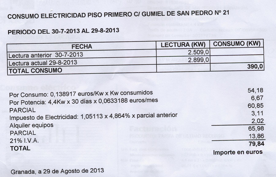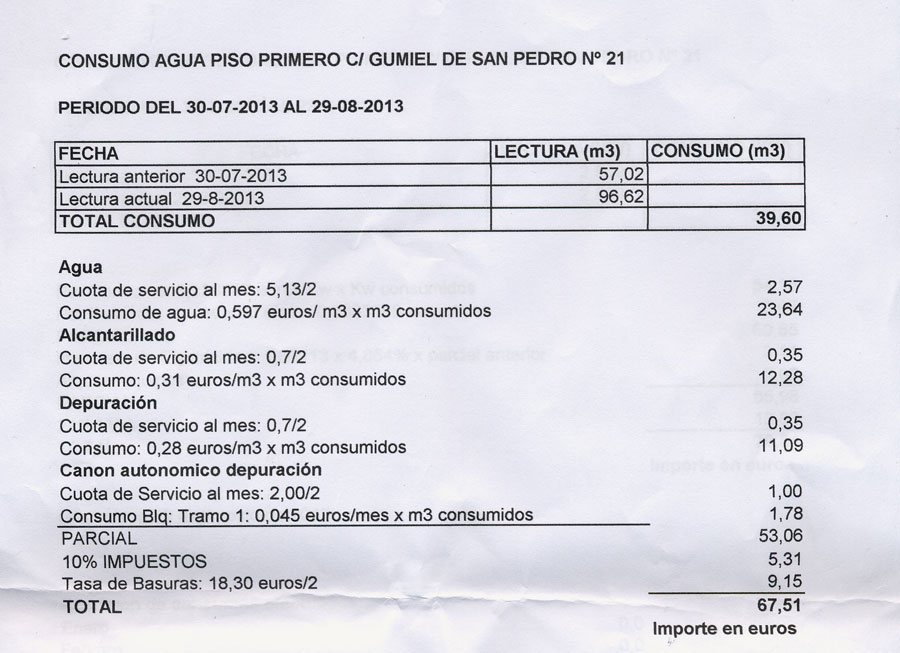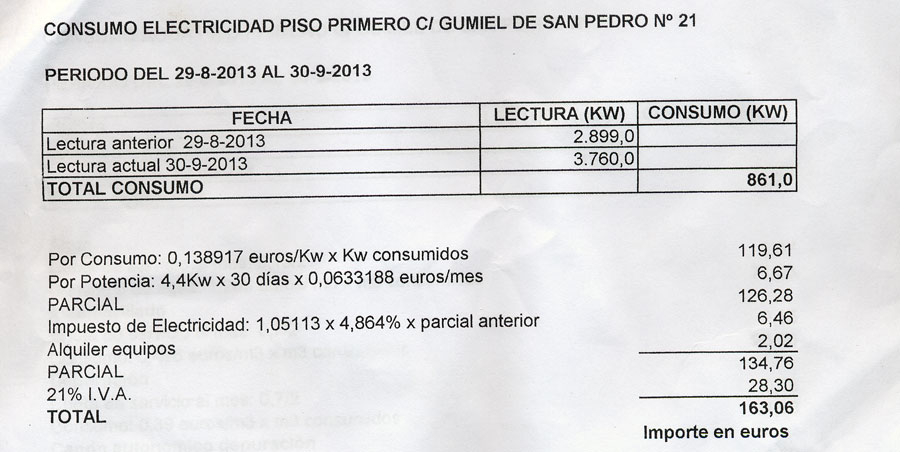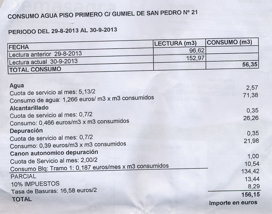 We have had far more visitors in September than in August, so we’ve managed to hit red tariff zones for electric power and water. In September we spent 861 KW of electricity priced at 0.1389 euro per KW, plus 21% tax and other electricity related costs (por potencia: 6.67 euro; alquiler equipos: 2.02 euro; impuesto de electricidad: 6.64 etc). Also in September, we spent 56.35 cubic metres of water priced at 1.266 euros per cubic metre. Our landlady said she had never seen such a thing in her life. Neither have we.