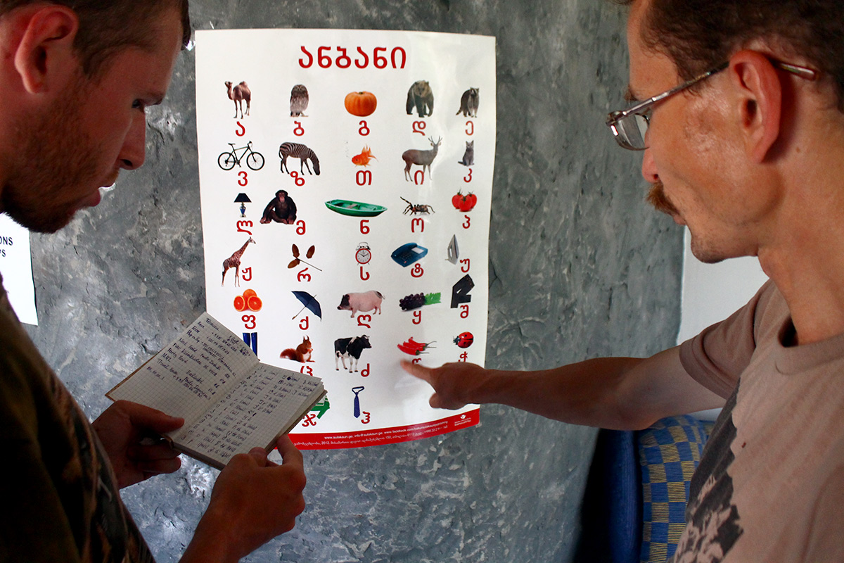 Daniela and Alex from Czech Republic/Germany put Georgian alphabet on the wall, so that we can look helplessly at it.
