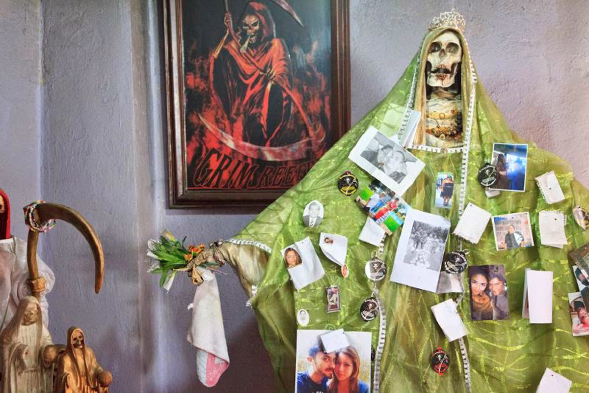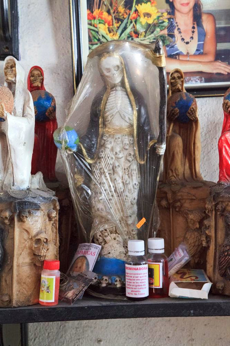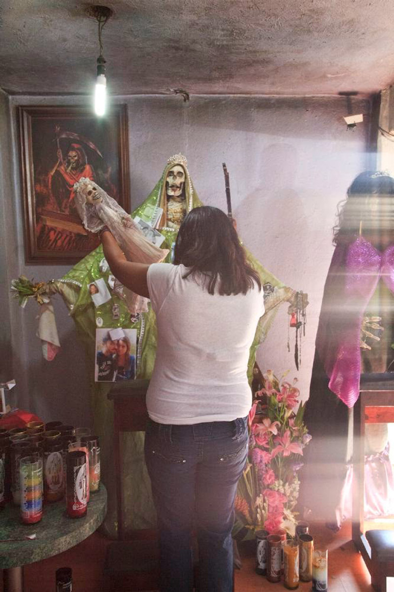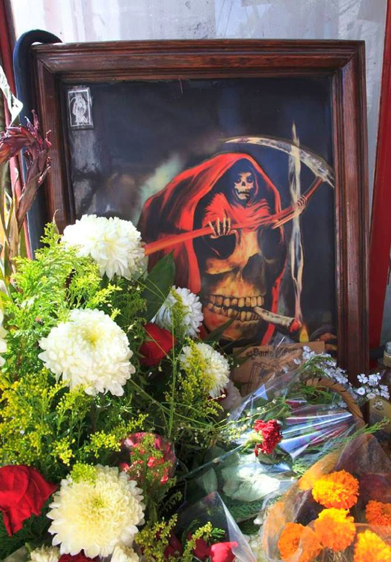 Santa Muerte - literally "Holy Death" or "Saint Death" - is the sacred figure of death personified as a woman. She is venerated by an ever growing number of people in Mexico and beyond, and is especially popular with disenfranchised members of society such as criminals, prostitutes, transvestites, homosexuals, prisoners, the very poor, and other people for whom conventional Catholicism has not provided a better or a safer life. The phenomenon is thought to have its roots in a syncretism of the beliefs of the native Latin Americans and the colonizing Spanish Catholics.