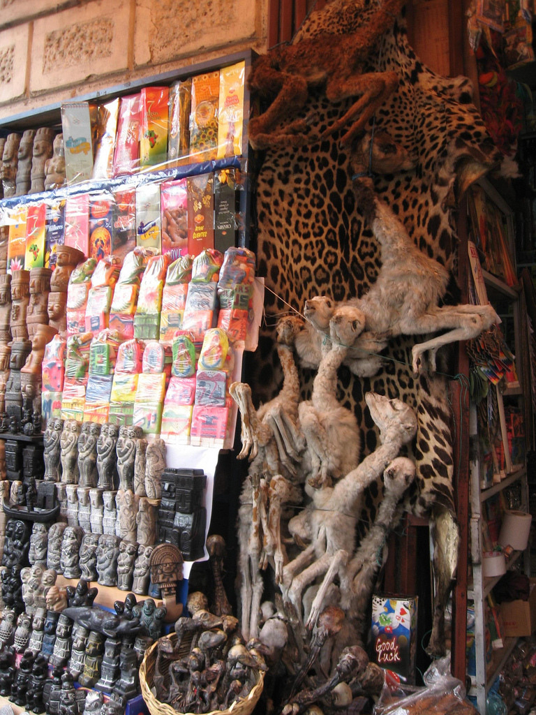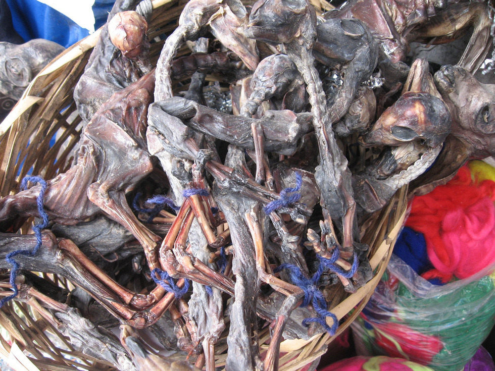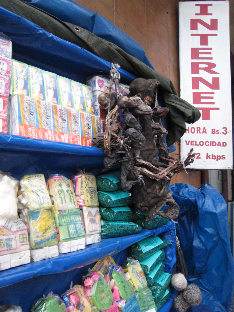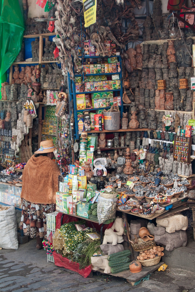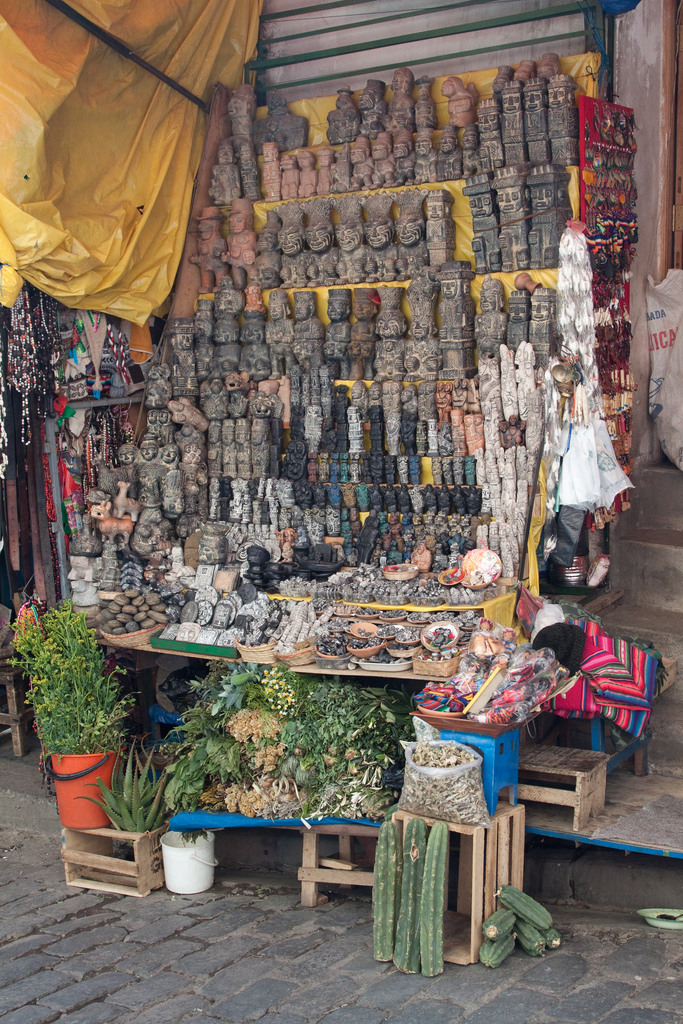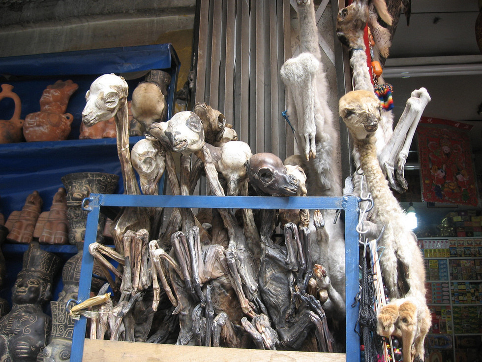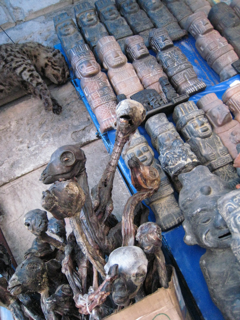 Among the many items sold at the market are dried llama fetuses that are said to bring both prosperity and good luck, dried frogs used for Aymara rituals, soapstone figurines, aphrodisiac formulas, owl feathers, dried turtles and snakes, herbs, and folk remedies. Witch doctors in dark hats and dresses wander through the market offering fortune-telling services.