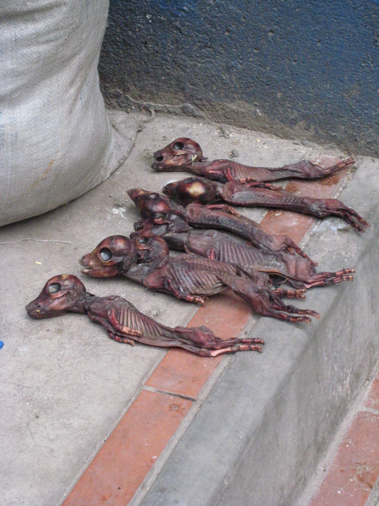 The dried llama fetuses are the most prominent product available at the market. These animals are fairly large and are used throughout the country, buried in the foundations of new buildings as an offering to the goddess Pachamama. It is believed that the buried llama fetuses keep construction workers safe, but these are only used by poor Bolivians. Wealthy Bolivians usually sacrifice a living llama to Pachamama.