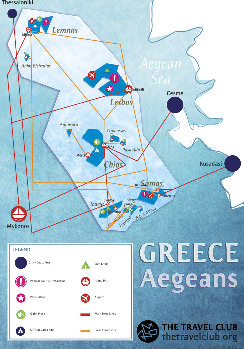 Use the legend to find out where are the ports, airports, touristic localities and inhabited places, which islands are suitable for wild camping, for partying and which ones have the organised camp sites. Click on any of them to see it enlarged.