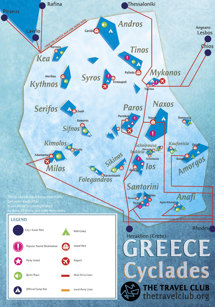 Map of Cyclades: Amorgos, Anafi, Andros, Ios, Kea, Kimolos, Kythinos, Milos, Mykonos, Naxos, Paros, Santorini, Sifnos, Sikinos, Syros, Tinos, Folegandilos, Kaufonisia, Schoinousa, Irakleia, Donoussa