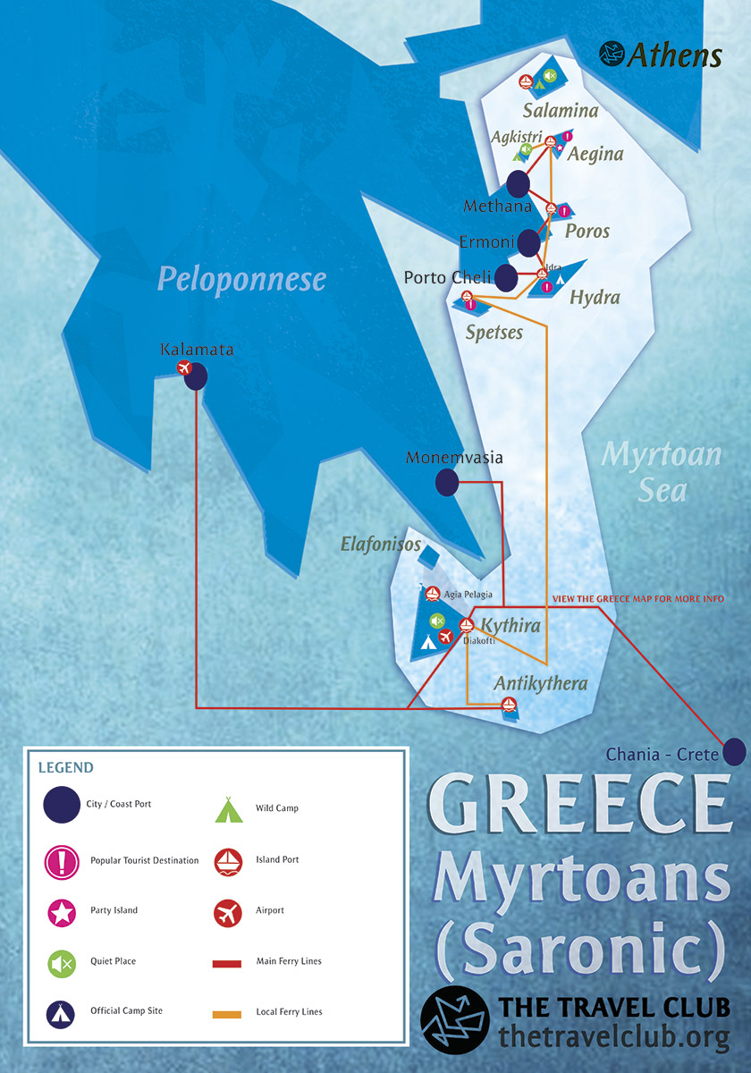 Map of Saronic Islands: Salamina, Aegina, Poros, Hydra, Spetses, Agkistri, Elafonisos, Kythira, Antikythira